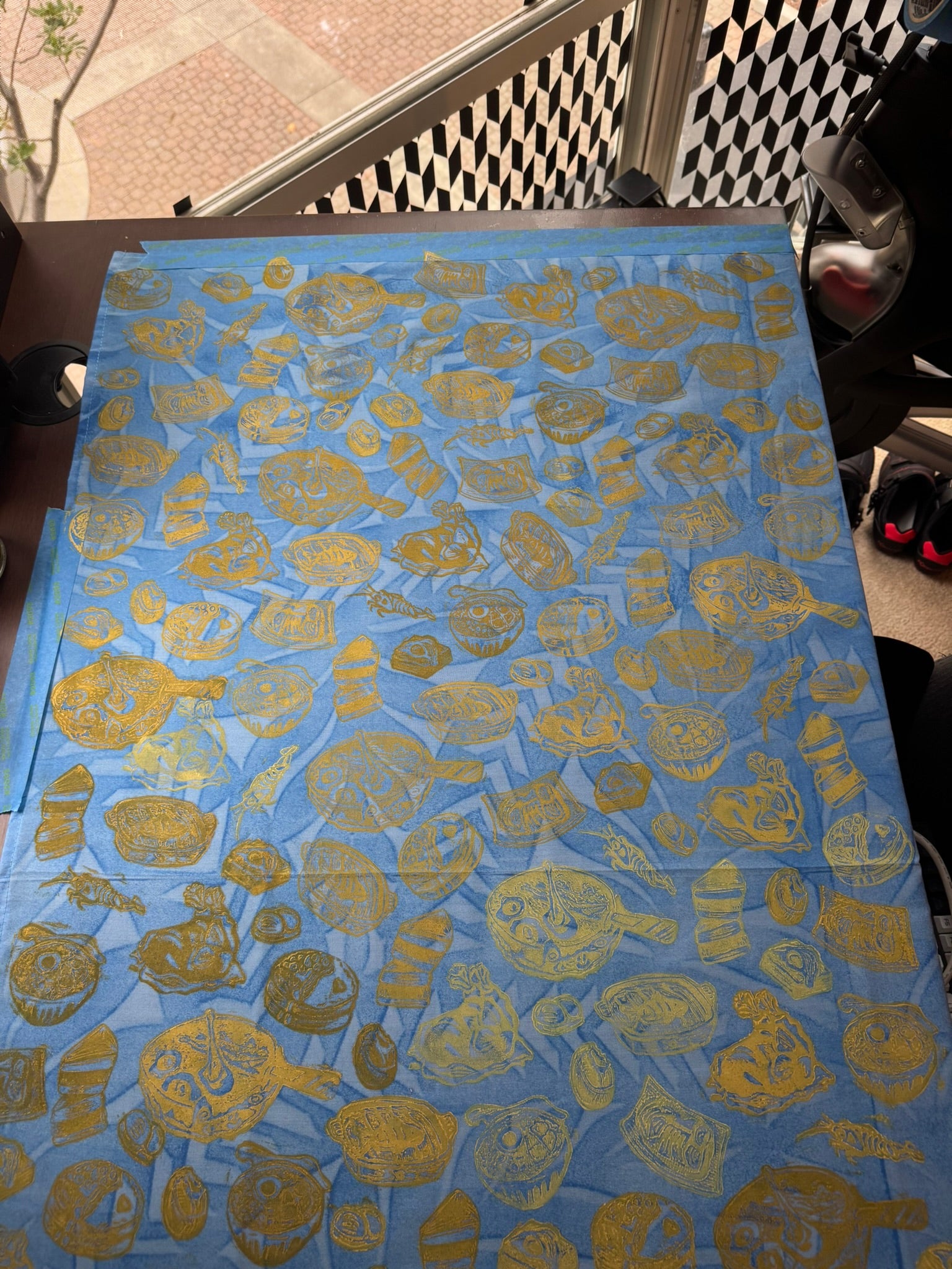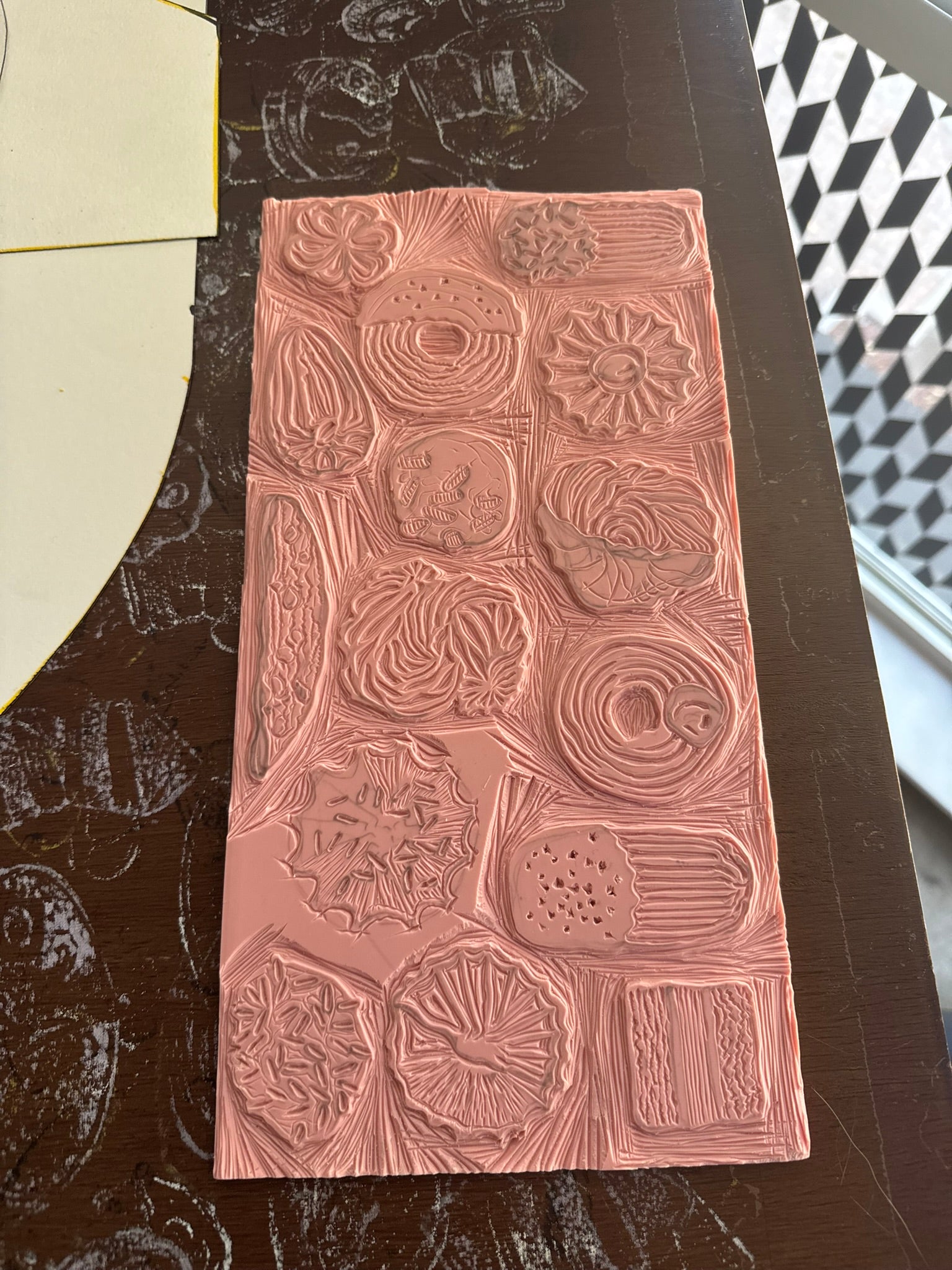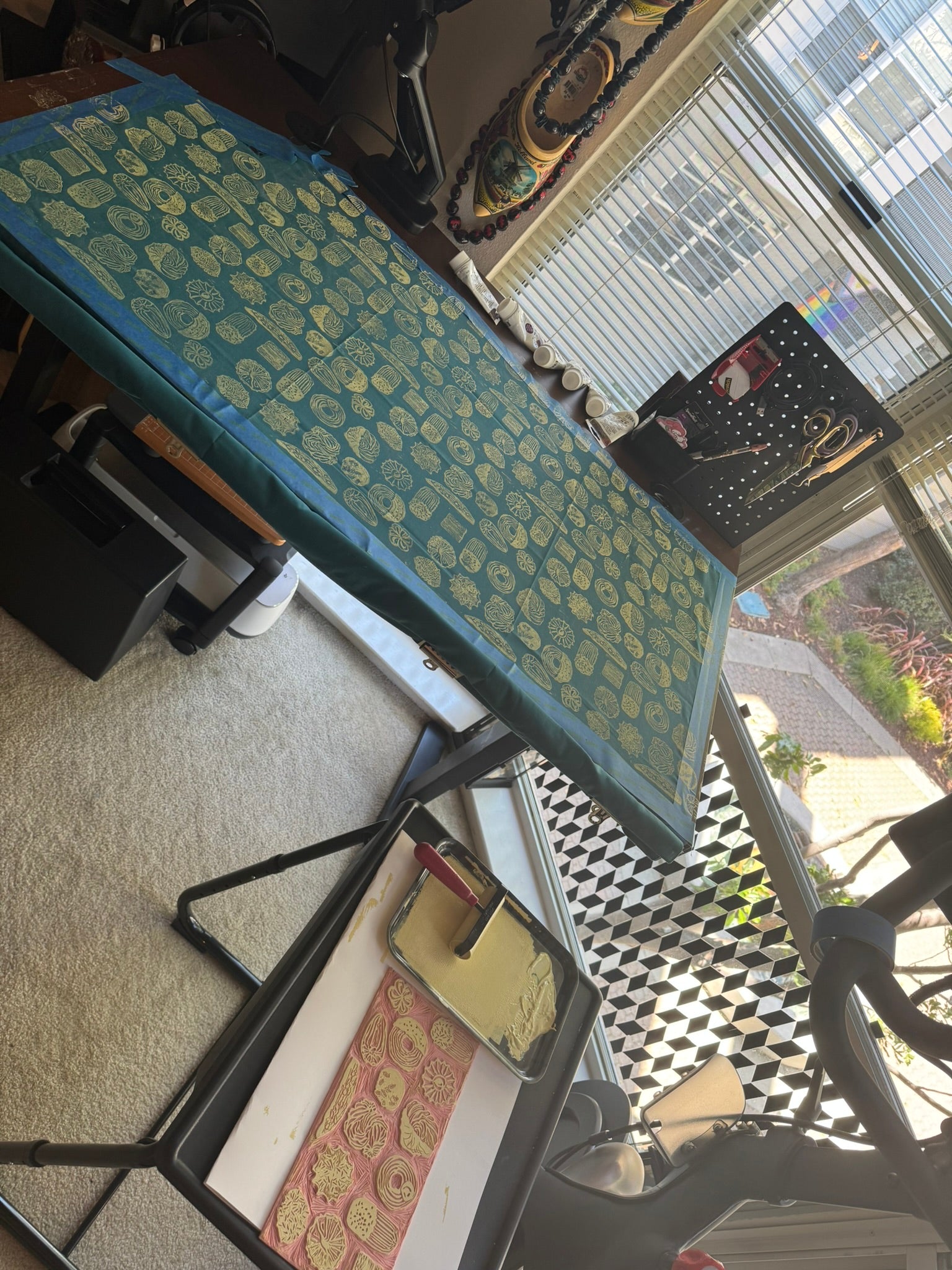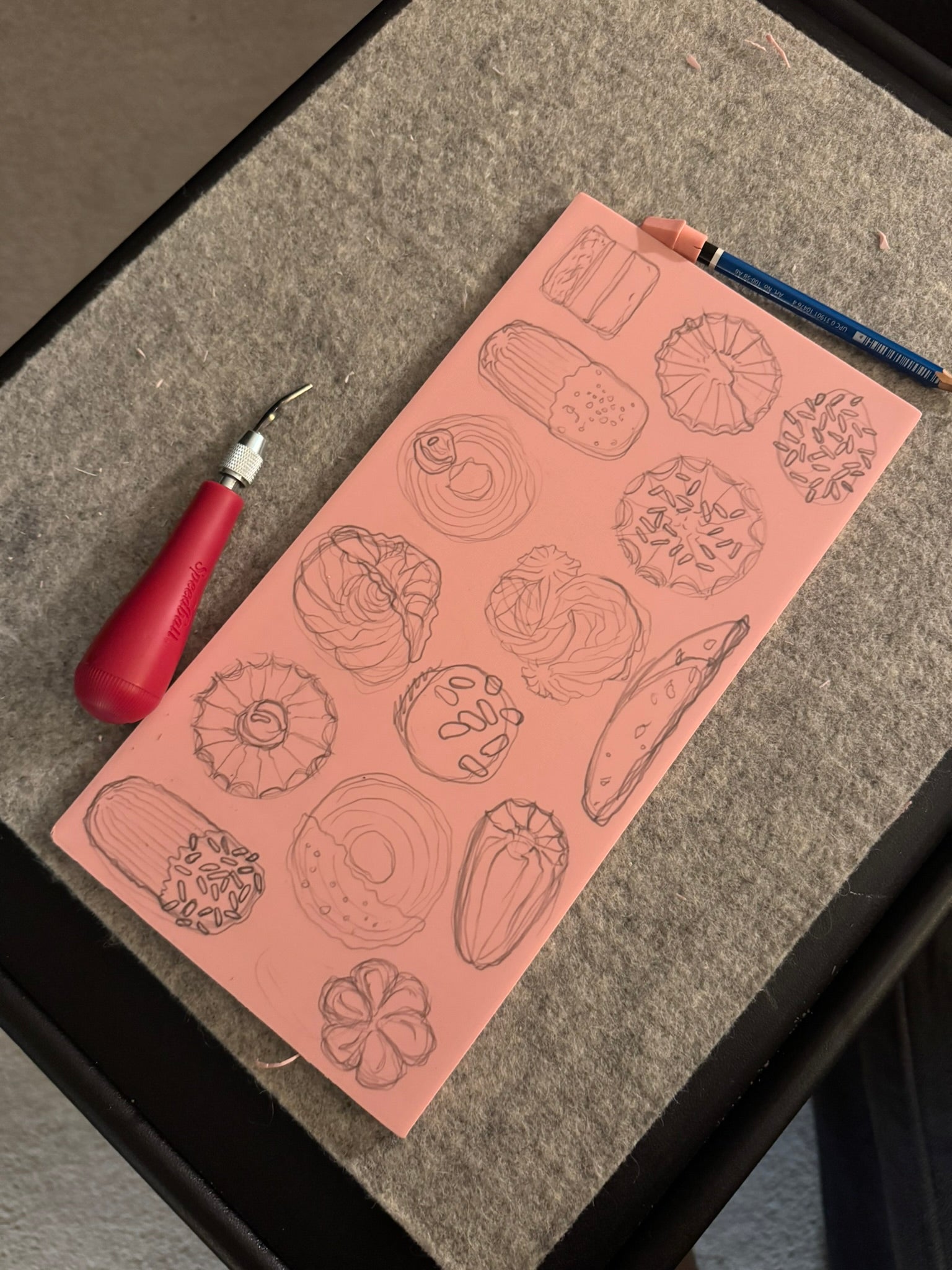 A treasure trove of snacks and cookies to loot. I was deep into my favorite dungeon crawler while carving all the pieces that went into the two styles available, snacks & cookies. Carving and the physicality of printmaking and sewing processes are a needed break from screen-based games for me.
