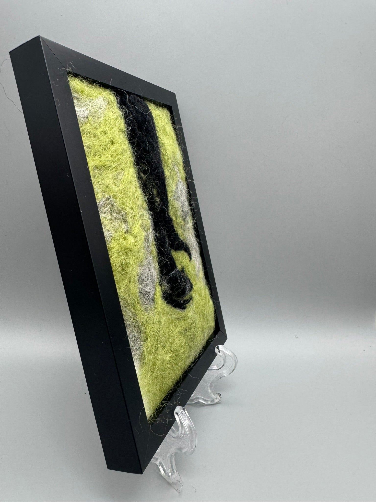 Needle-felted talon; contrasting some serious power against the fluffy wool roving. This bird is certified not-a-government-drone. It's 4" x 6" and frame mounted with a kickstand and can be easily hung. It's green, grey, fuzzy, and perfect for the oddities wall.