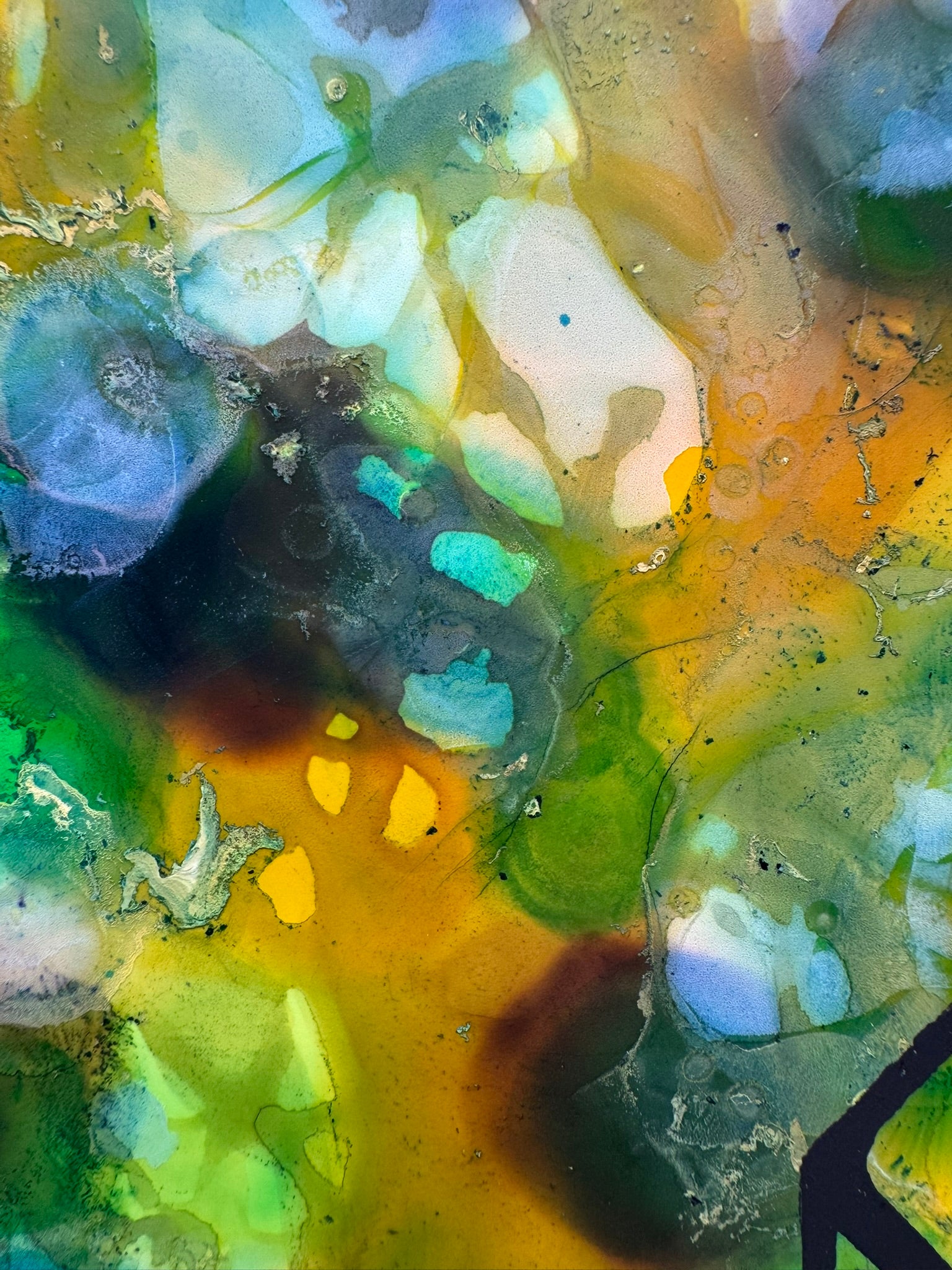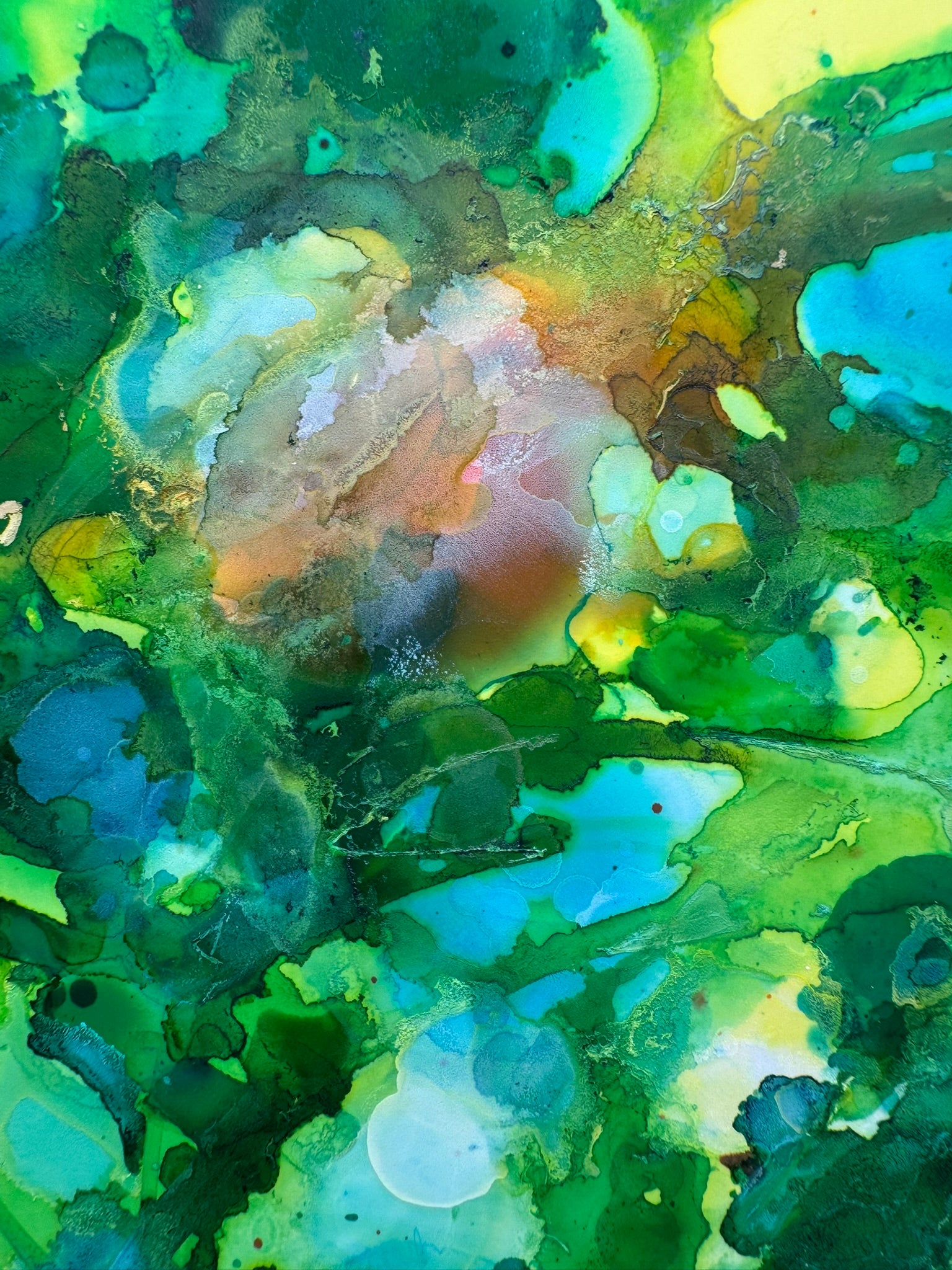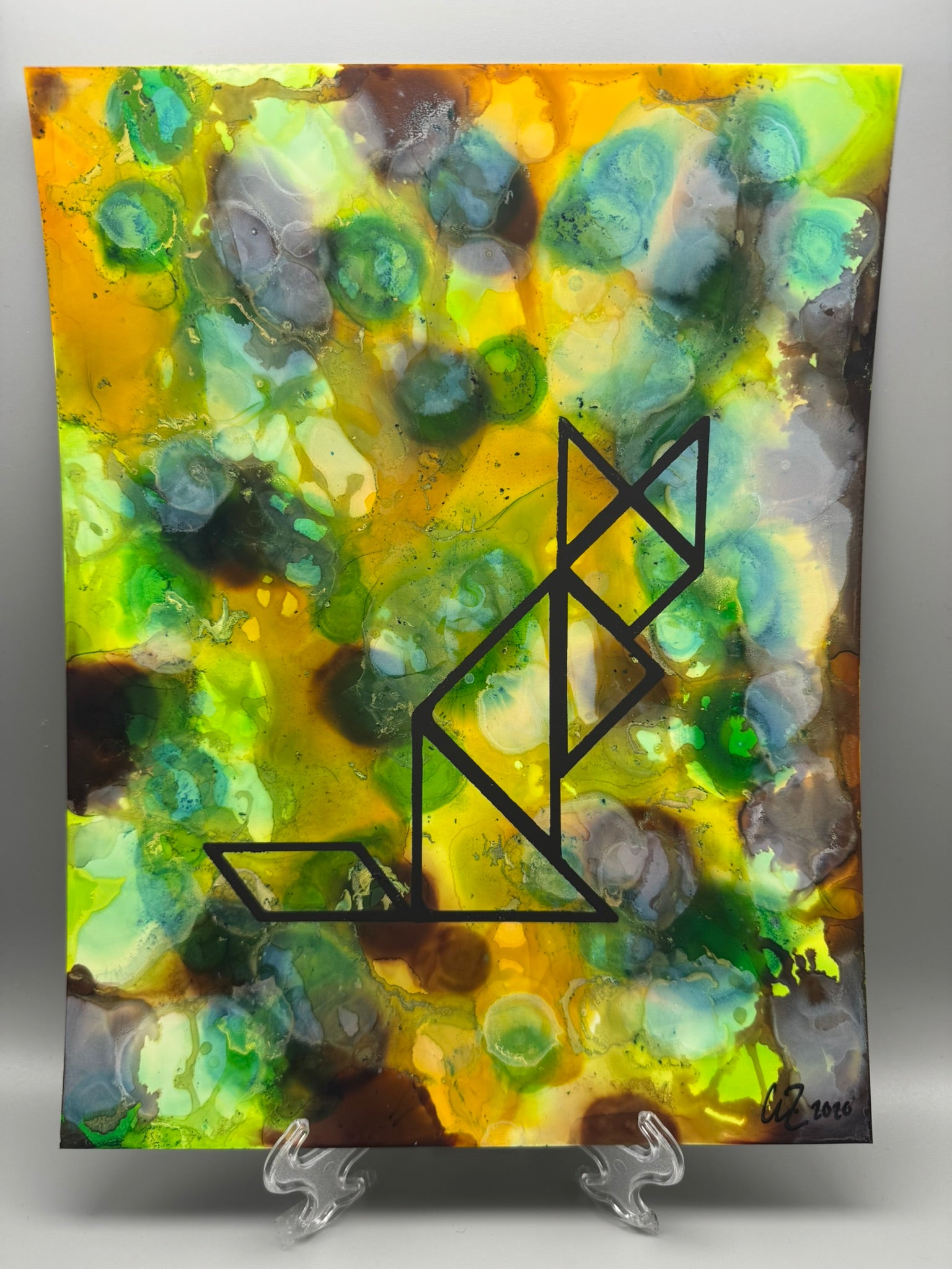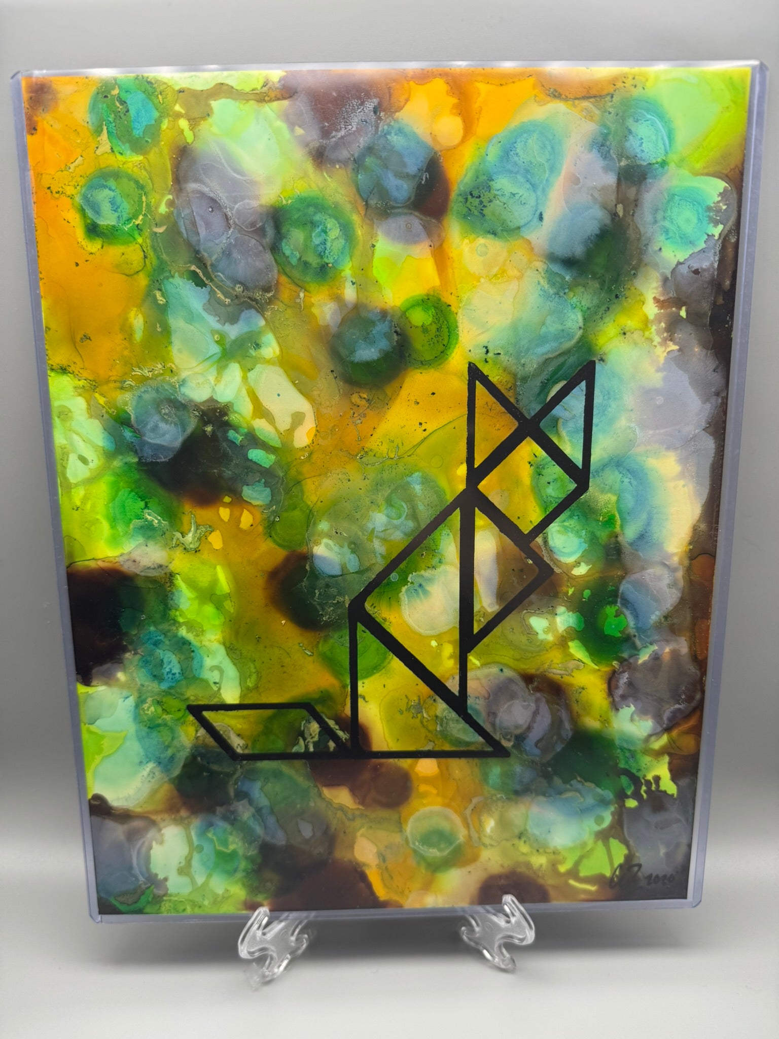 The 8.5" x 11" art piece is screen-printed over alcohol inks on thick synthetic paper protected by plastic print holder.